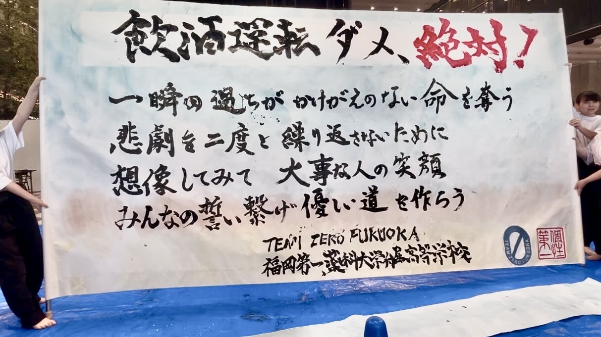 TEAM ZERO FUKUOKA 飲酒運転撲滅の誓い2024(8月20日) イベントに参加して飲酒運転撲滅を訴える書道パフォーマンスをしました。 また西日本新聞には博多高校と共同制作をした作品が記事になりました。詳しくはこちらの記事へ。