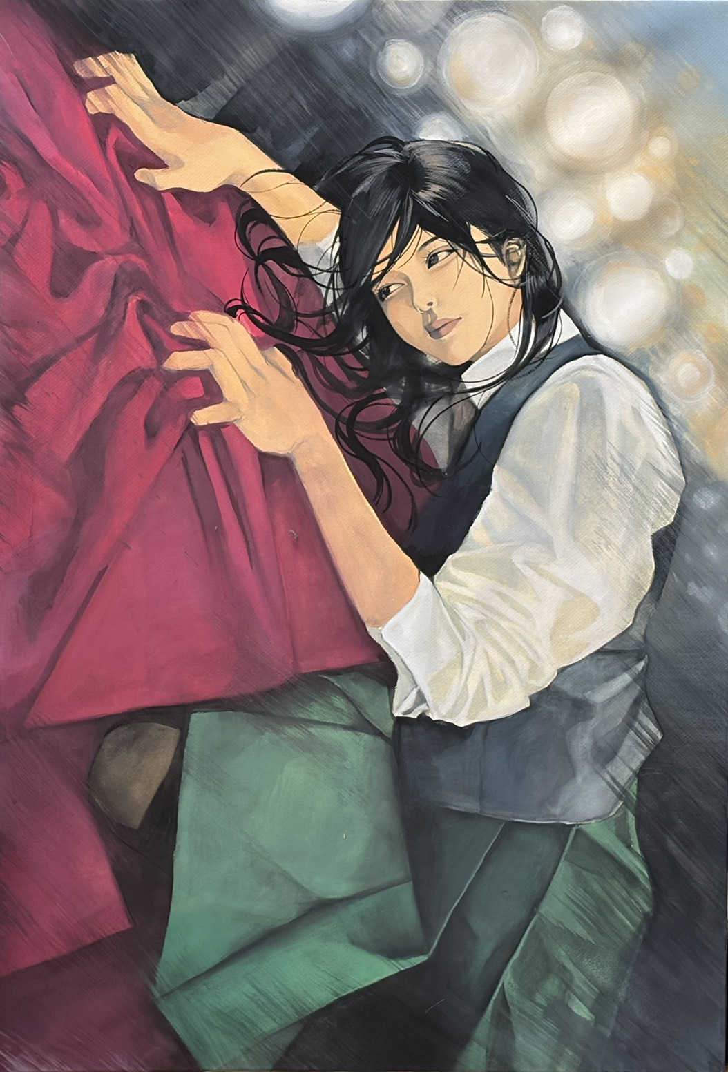 背景のカメラのフラッシュや強く握って出来た布のシワ、表情などで表現しました。