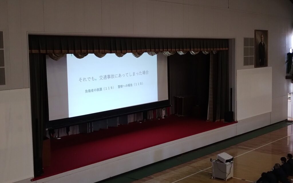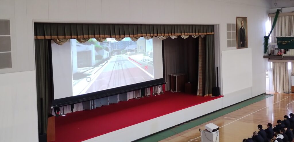 講習中、生徒たちはスクリーンを見ながら真剣な表情で話に耳を傾け、安全意識の向上につながる有意義な時間となりました。