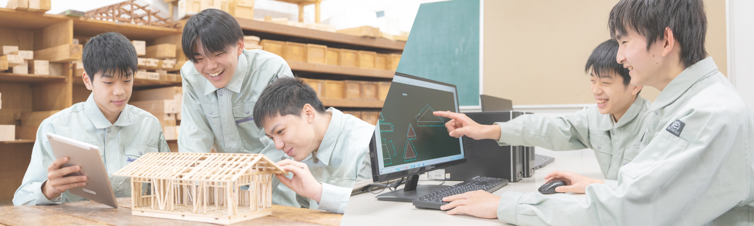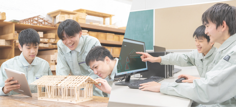 手仕上げ技術や設計製図(CAD)、ICT技術の活用や建築に関するデザインを学ぶことができます。
